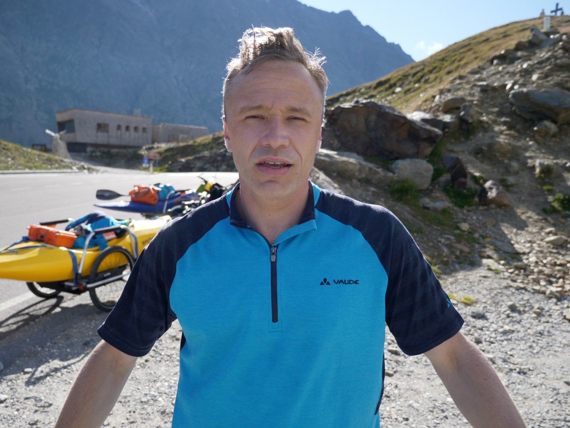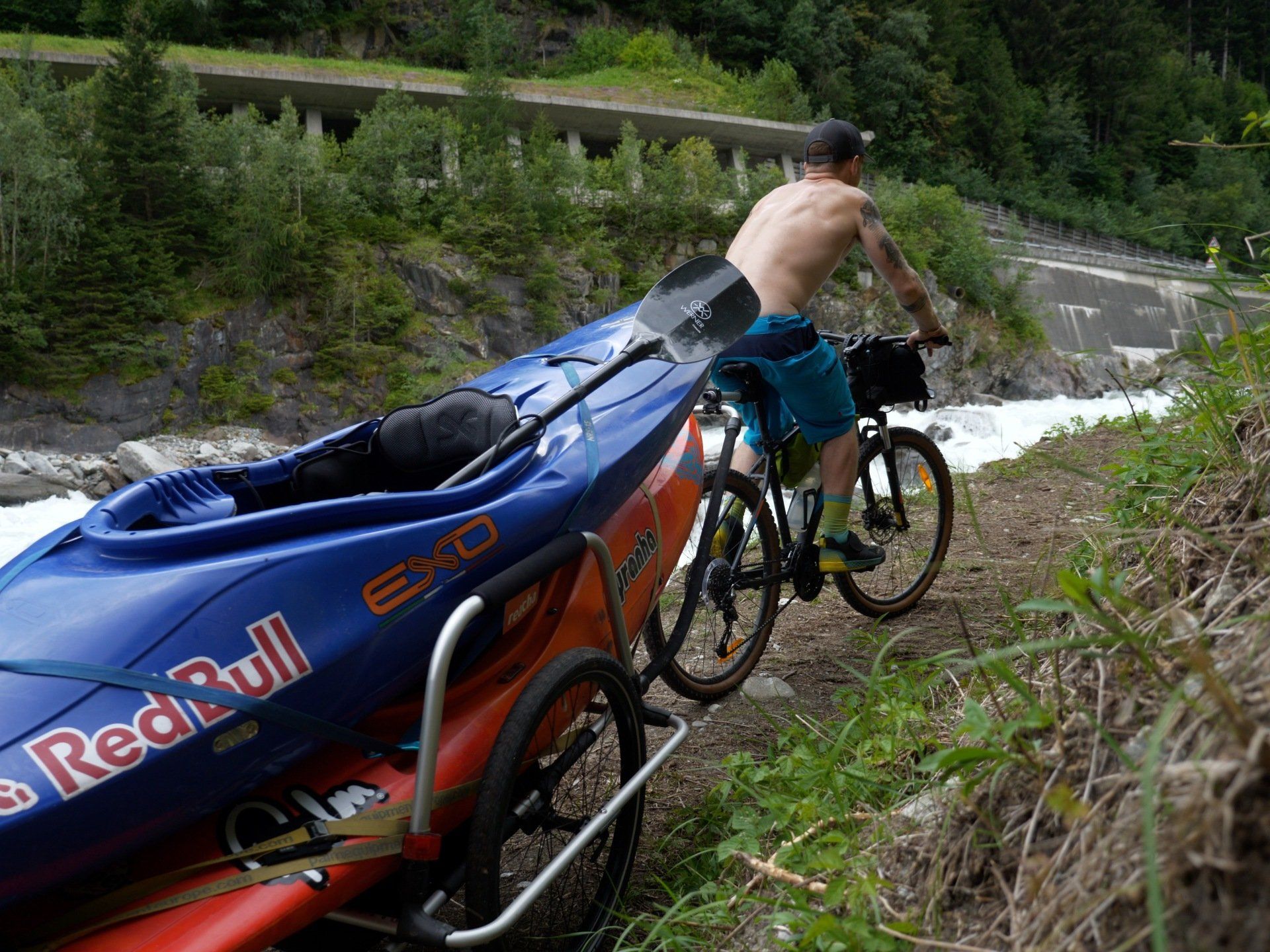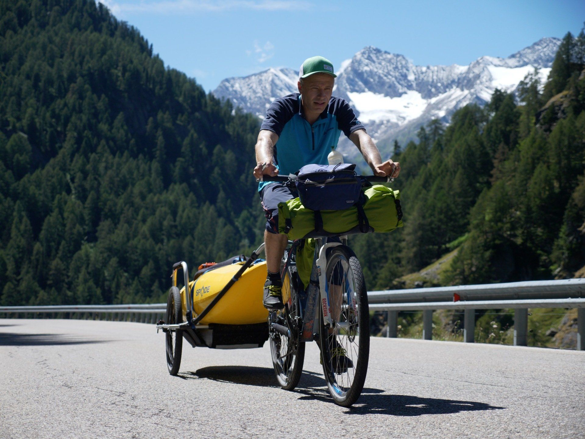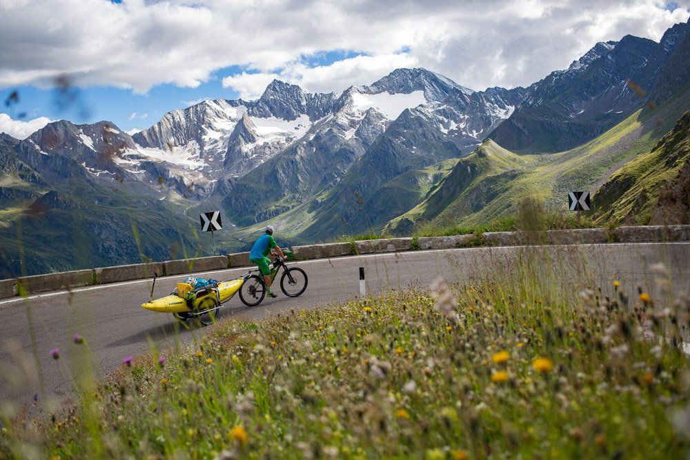 Über Alpenpässe wie das Timmelsjoch und die Großglockner-Hochalpenstraße geht es mit dem Bike bergauf, vorbei an donnernden Wasserfällen, durch spektakuläre Landschaften – und mit dem Kajak wieder runter.