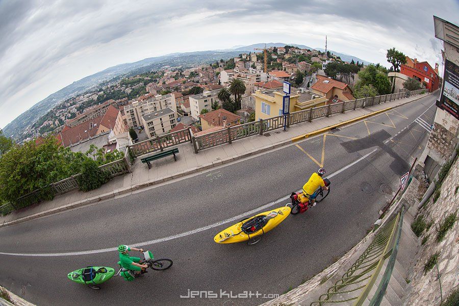 Vom Startpunkt in Cannes an der Côte d'Azur ging es durch die französischen Alpen hinüber nach Italien, durch das Piemont ins Schweizerische Tessin, weiter nach Graubünden, über die Grenze nach Österreich, das Inntal hinab, das Ötztal hinauf, übers Timmelsjoch nach Südtirol, von dort nach Osttirol, dann zur Soca nach Slowenien, um zum Abschluss die Kanäle Venedigs mit dem Kajak zu erkunden.