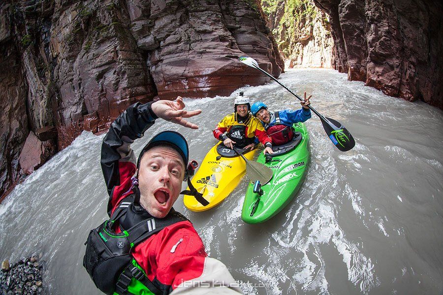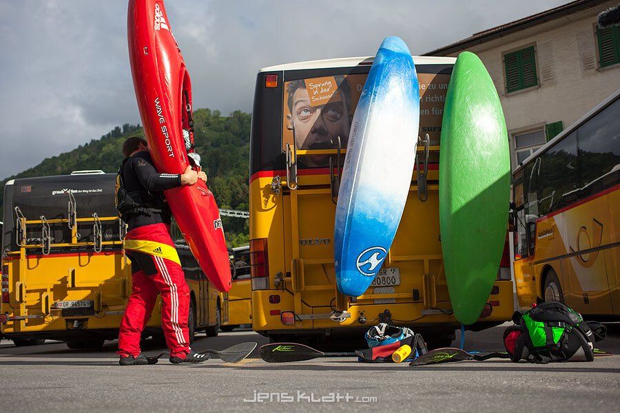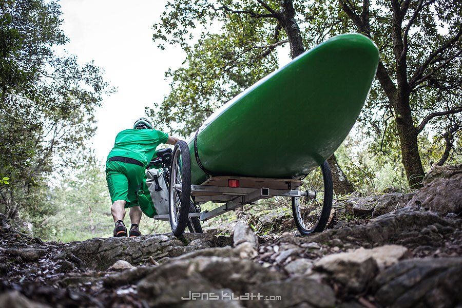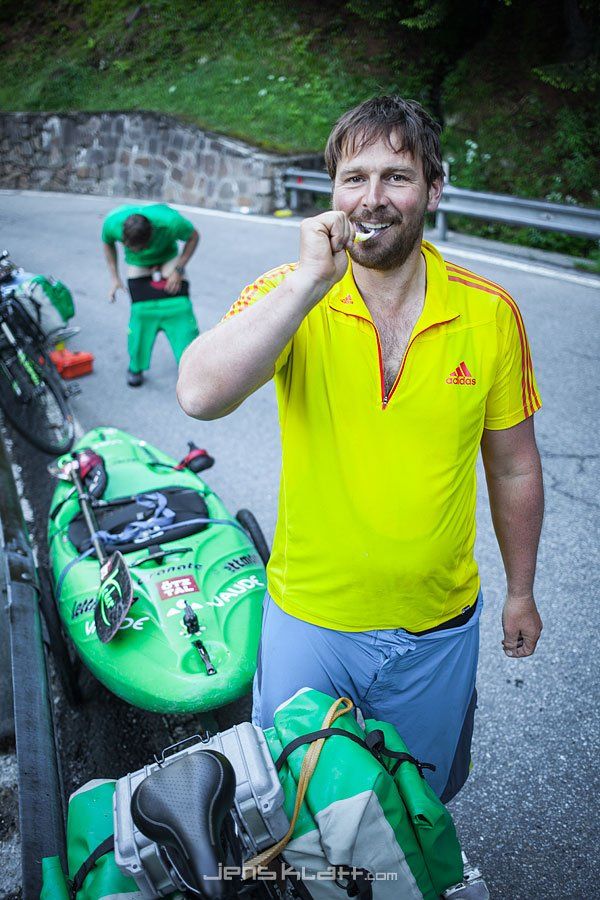 Der Plan war ambitioniert, die Strecke lang und die Berge hoch: Mit dem Kajak auf dem Radanhänger wollten Olaf Obsommer, Jens Klatt und Philip Baues einmal quer durch die Alpen radeln, von Fluss zu Fluss und immer auf der Suche nach dem schönsten Wildwasser. Nach 52 Tagen sind die drei Abenteurer dann tatsächlich an ihrem Ziel in Venedig angekommen – verschwitzt und erschöpft, aber mit einmaligen Erlebnissen der zweimonatigen Reise im Gepäck. Alles, was Olaf, Jens und Philip unterwegs brauchten hatten sie in Radtaschen und auf dem Bootsanhänger dabei: die Kajakausrüstung, Schlafsack, Zelt und Isomatte, Kocher, Verpflegung und natürlich die Foto- und Videoausrüstung, um diesen einmaligen Trip zu dokumentieren.
